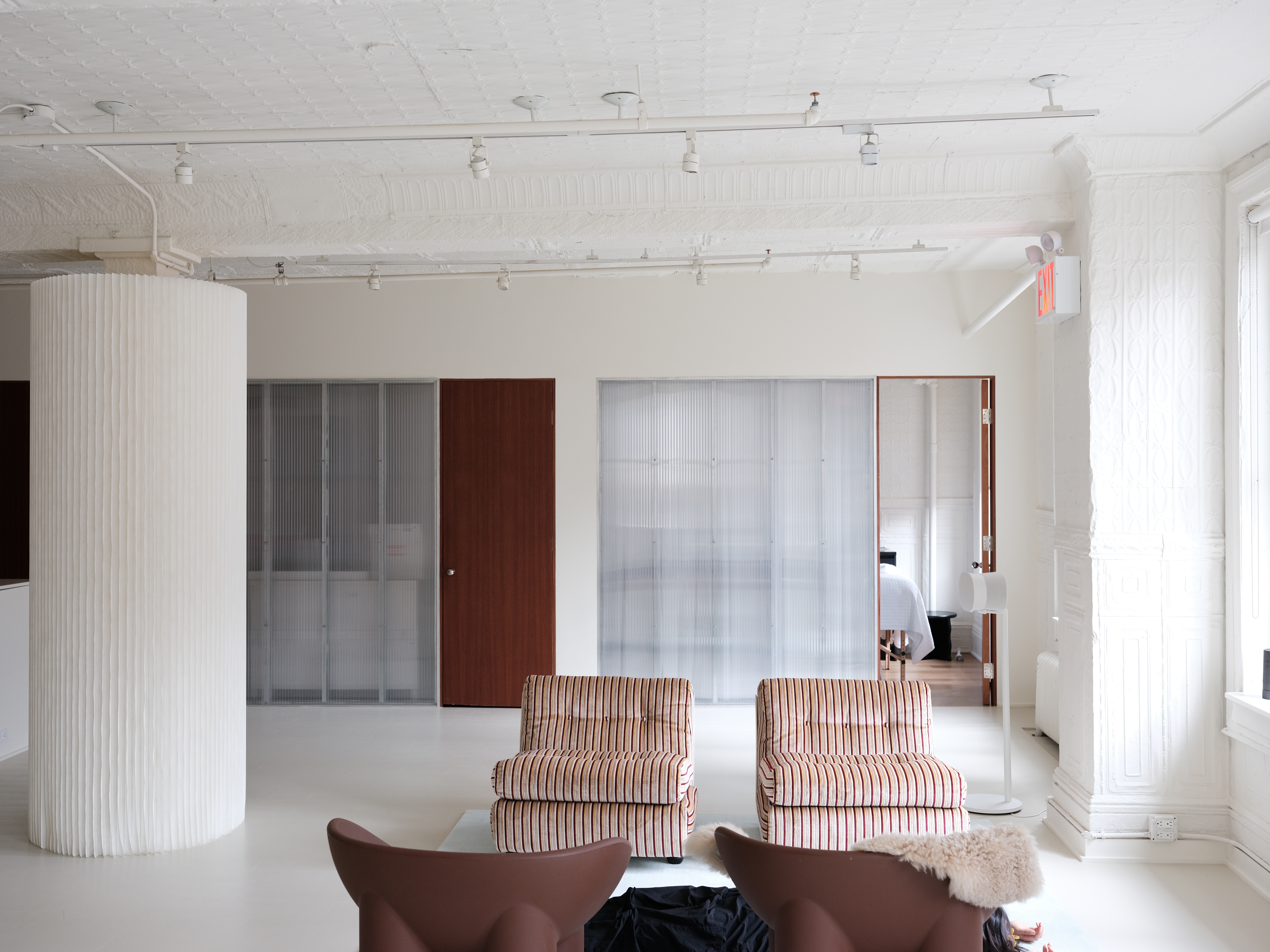 At the scale of form and plan, familiar architectural typologies are abstracted and redistributed across the floor plate. The project is conceived as a landscape of interventions rather than a series of discrete rooms, allowing moments of enclosure, openness, and transition to unfold gradually. Central to this strategy is the reinterpretation of the pyeongsang (평상), traditionally a raised platform located in a shared front yard and used for resting, conversation, and food preparation. Here, the pyeongsang is reframed as a contemporary spatial device: a shared platform within the interior that supports informal gathering and collective pause, offering a place of respite from the surrounding city. Treatment rooms are positioned as immersive and private spaces within this landscape, providing moments of retreat that contrast with the more communal zones.